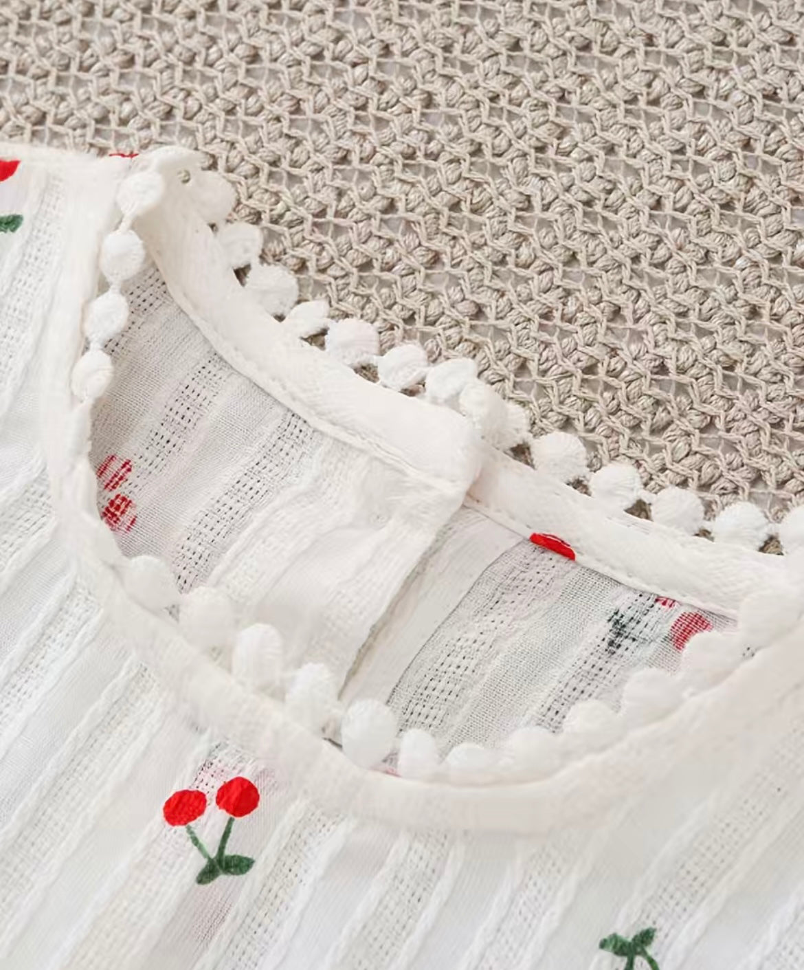 Light breathable fabric - Sleeveless onesie dress - Color: White with red cherrys